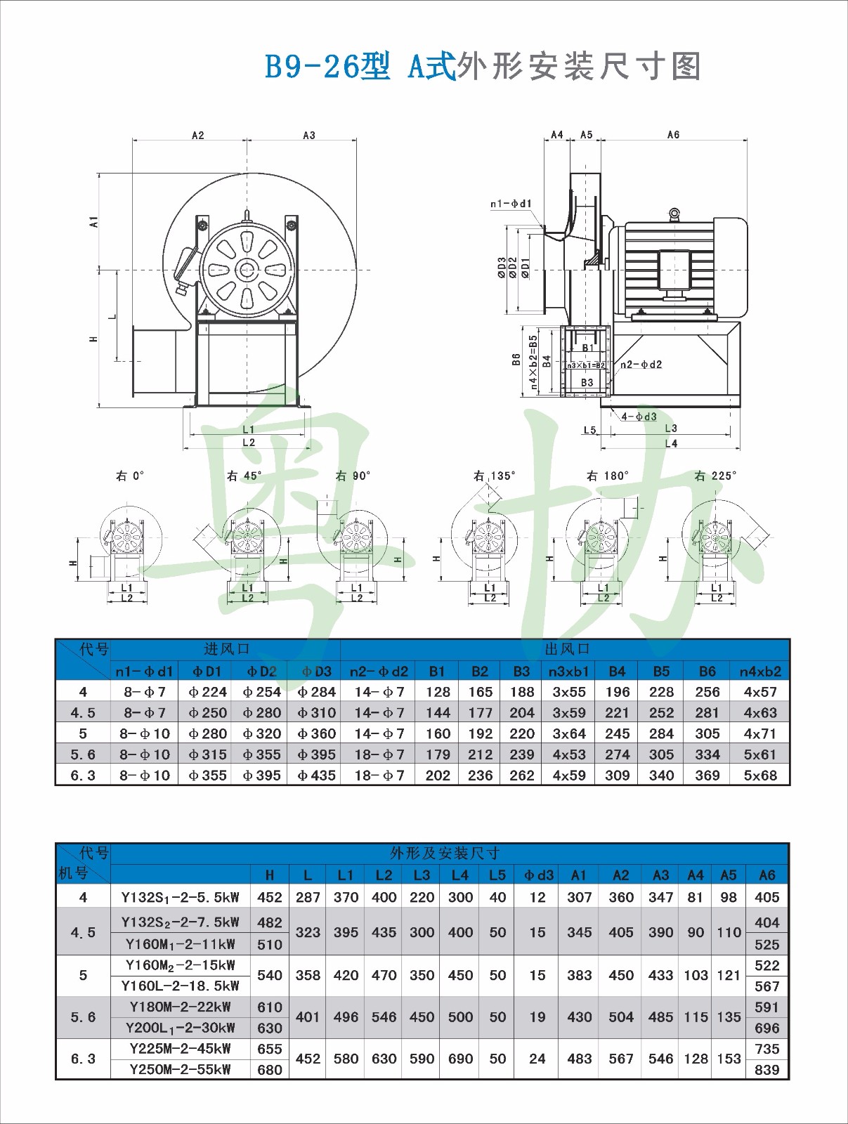 從電動(dòng)機(jī)一側(cè)正視,葉輪順時(shí)針旋轉(zhuǎn),稱為右旋風(fēng)機(jī),以“右”表示,葉輪逆時(shí)針旋轉(zhuǎn),稱為左旋風(fēng)機(jī),以“左”表示。風(fēng)機(jī)的出口位置,以機(jī)殼的出風(fēng)角度表示。9-26型風(fēng)機(jī)NO2.6-6出廠時(shí)均做成1種形式,使用單位根據(jù)要求再安裝成所需要的位置,訂貨時(shí)不需注明。NO2.8出風(fēng)口位置調(diào)整范圍0°~225°,間隔是22.5°。NO8~12出風(fēng)口位置調(diào)整范圍0°~225°,間隔是45°。NO16~20出風(fēng)口位置制成固定的三種0°、90°、180°,不能調(diào)整,訂貨時(shí)需注明。風(fēng)機(jī)的傳動(dòng)方式有A、B、C、D四種。4-72型風(fēng)機(jī)中NO2.8-6采用A式傳動(dòng),NO8-12采用C、D式傳動(dòng),NO16-20采用B式傳動(dòng)。