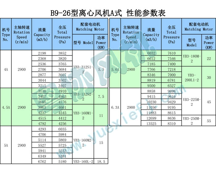 B9-26 A式高壓防爆離心風(fēng)機(jī)的性能與選用件及基礎(chǔ)尺寸與9-26型一致,可按其樣本選擇。該風(fēng)機(jī)結(jié)構(gòu)基本與9-26型相同,No2.8-6A采用B35型帶法蘭盤與底腳的電動(dòng)機(jī)。No6~12C、D電動(dòng)機(jī)選用該表中與Y系列對(duì)應(yīng)的YB系列,安裝型式為B3。